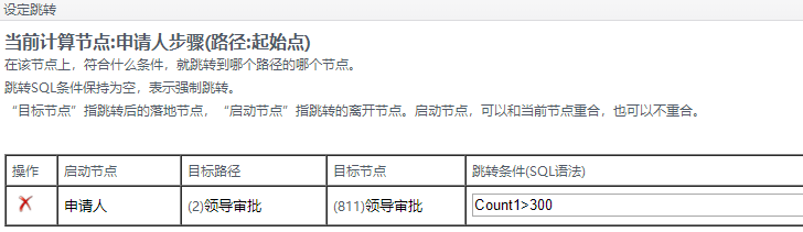 | 6.在流程发起人属性中设置跳转路径。在该节点上,符合什么条件,就跳转到哪个路径的哪个节点。跳转SQL条件保持为空,表示强制跳转。“目标节点”指跳转后的落地节点,“启动节点”指跳转的离开节点。启动节点,可以和当前节点重合,也可以不重合。